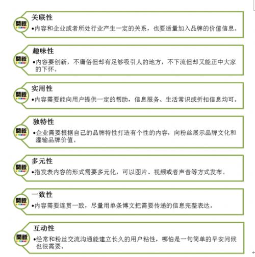 在做好企业微博内容定位后,结合所设定位,接下来就要进行内容的筛选,制定范围和标准。通常,发布博文信息是为了吸引用户的注意以增加用户的粘性和适当体现品牌的价值。不同的博文可以有不同的特性,企业可以根据博文的性质来筛选合适的内容。就微博内容而言,可以从下列7个方面对其进行筛选: